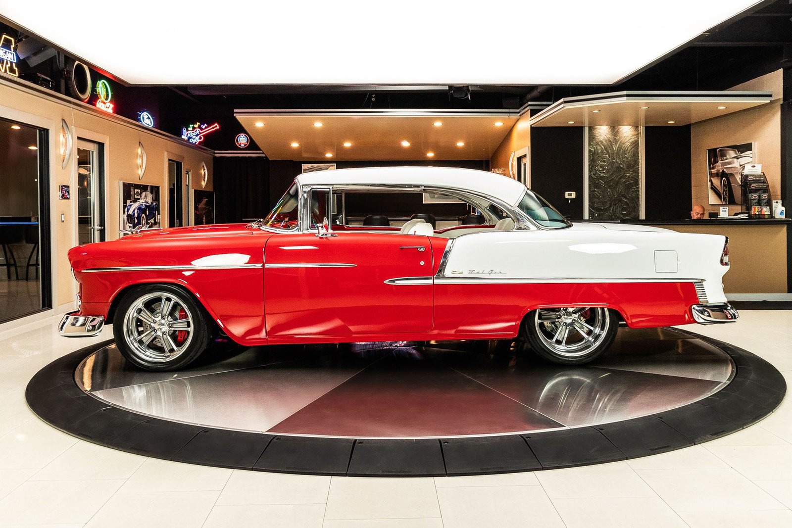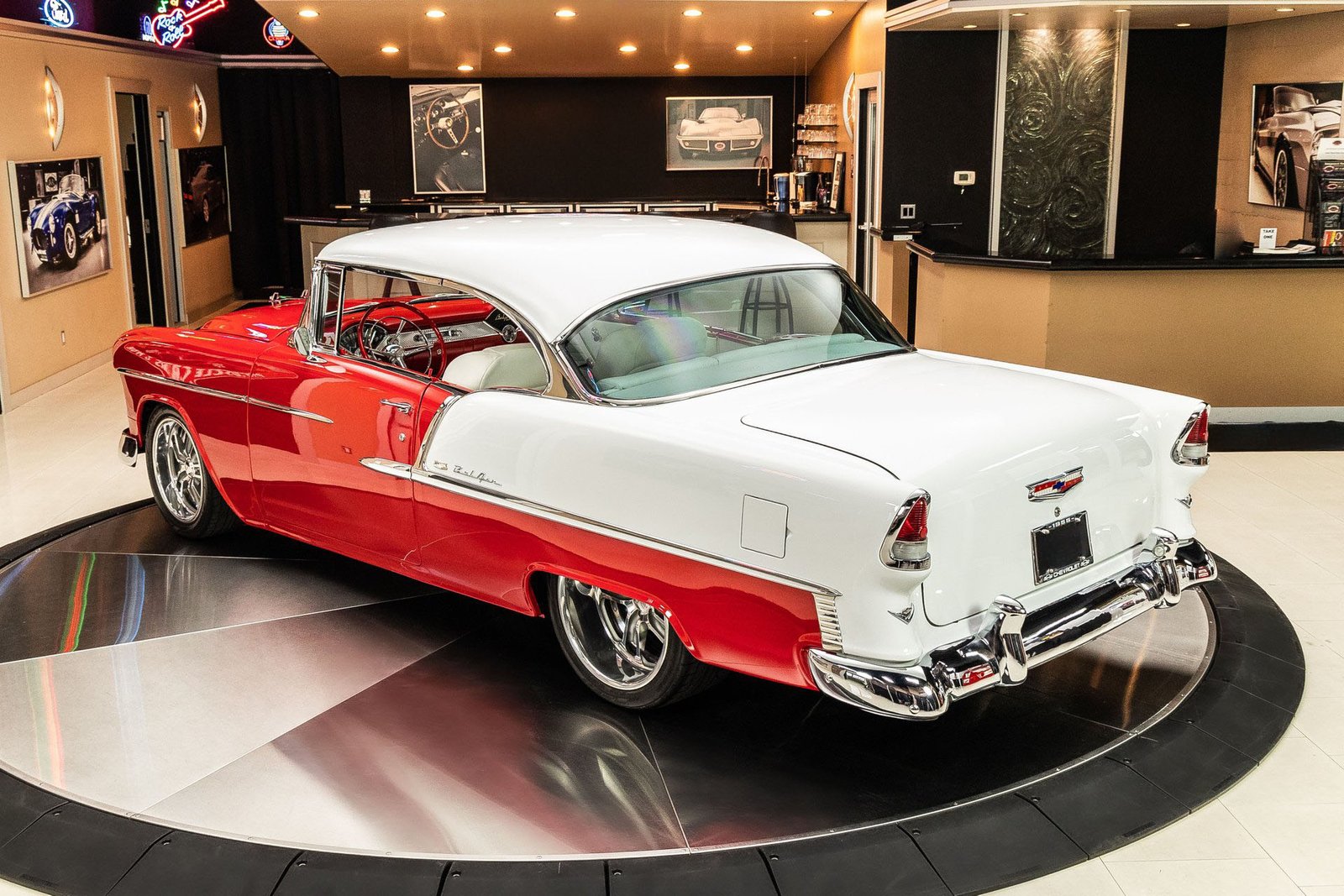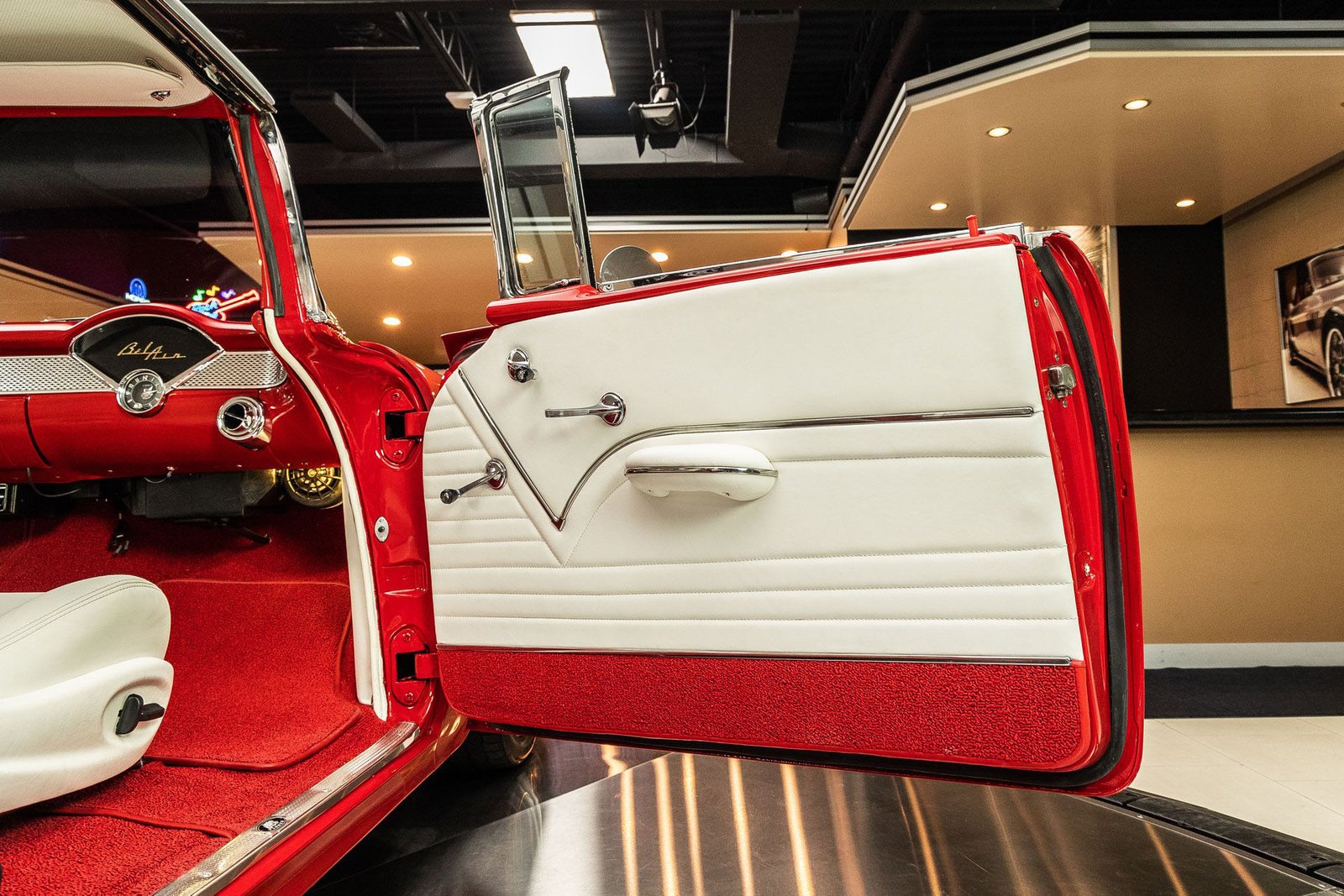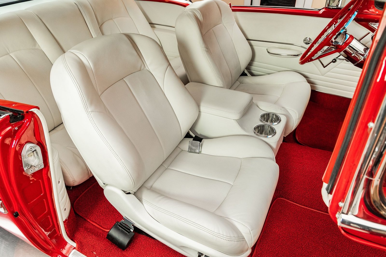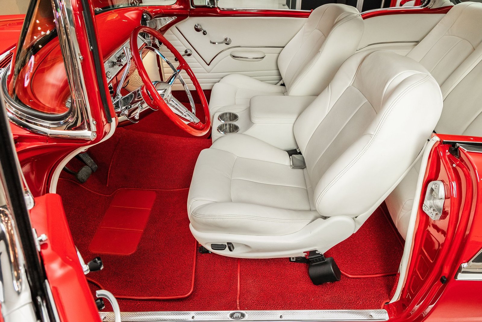 Finished in a striking red and white exterior, the body presents with laser-straight panels and mirror-like paint that highlight the iconic Tri-Five silhouette. Inside, the cabin features custom seating, upgraded interior trim, and thoughtful conveniences that make the car enjoyable for long drives or car show weekends. The fully finished trunk and clean undercarriage further reflect the high level of craftsmanship throughout the build.