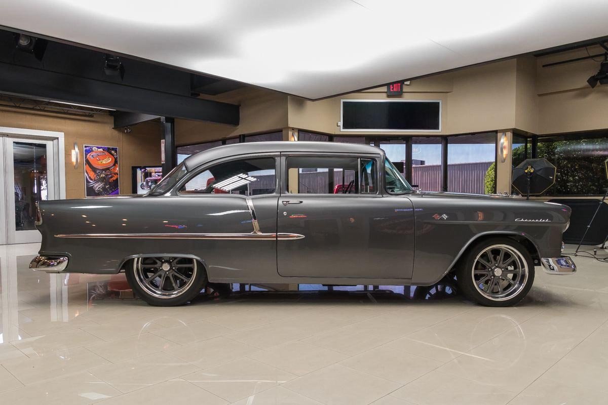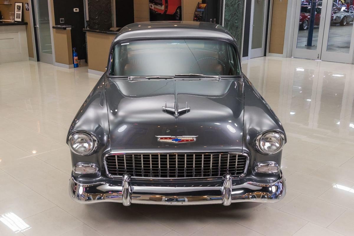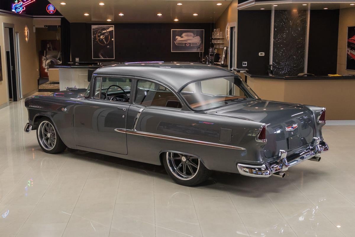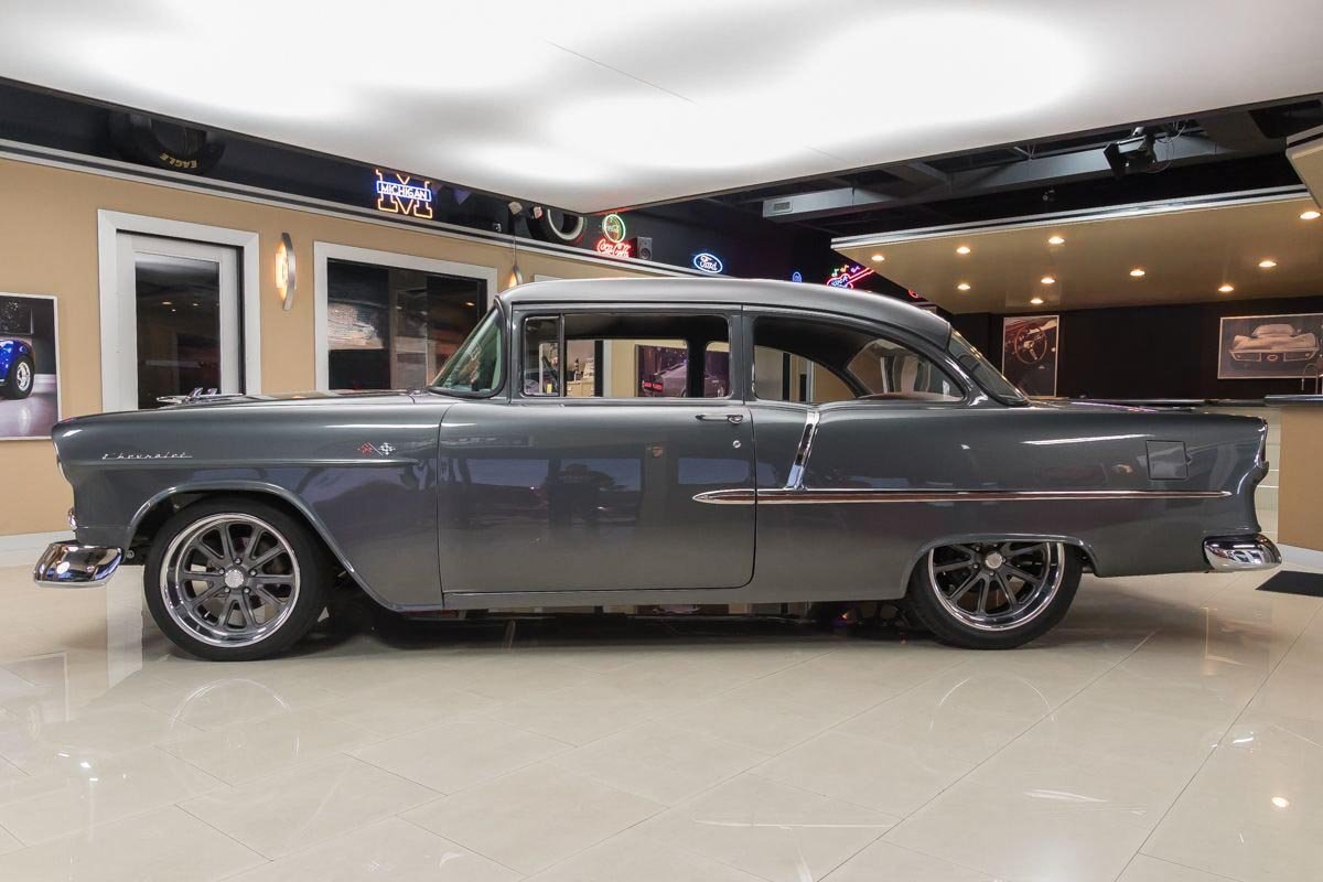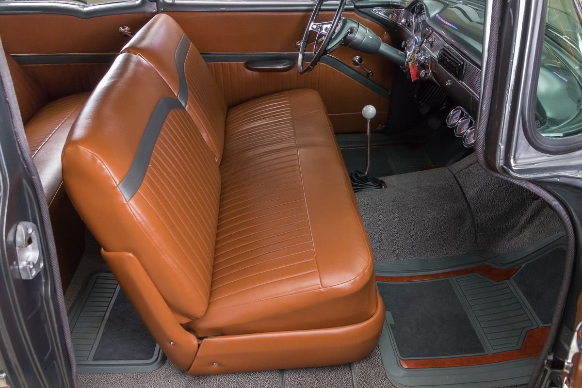 This example has benefited from a complete frame-off, nut-and-bolt rotisserie restoration, resulting in a car that presents beautifully from every angle. With very limited mileage since completion, it retains the fresh, tightly assembled feel enthusiasts look for in a high-quality restoration. Finished in a striking graphite gray, the exterior highlights the Bel Air’s crisp lines and polished trim, while the lowered stance gives it a subtle, modern edge without losing its classic identity.