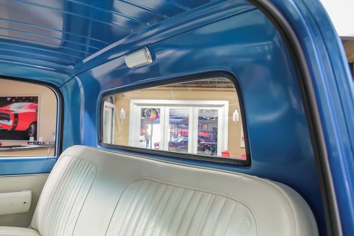 Finished in a medium blue metallic exterior, the truck presents with straight bodywork, excellent trim, and a classic stance. Inside, the white and blue interior closely mirrors the original factory look, featuring restored upholstery, a column shifter, and a clean, detailed dashboard. This C-10 delivers an authentic late-1960s pickup experience, restored to be driven, enjoyed, and proudly shown.