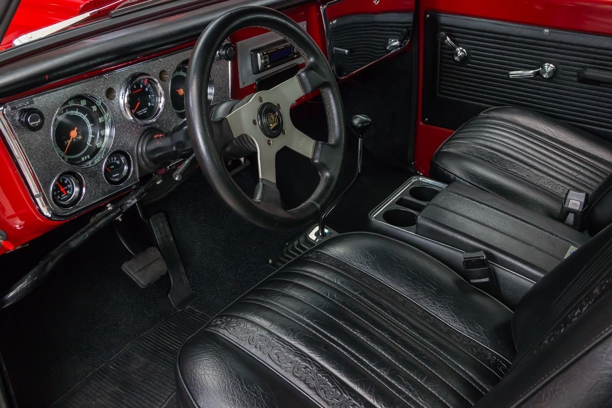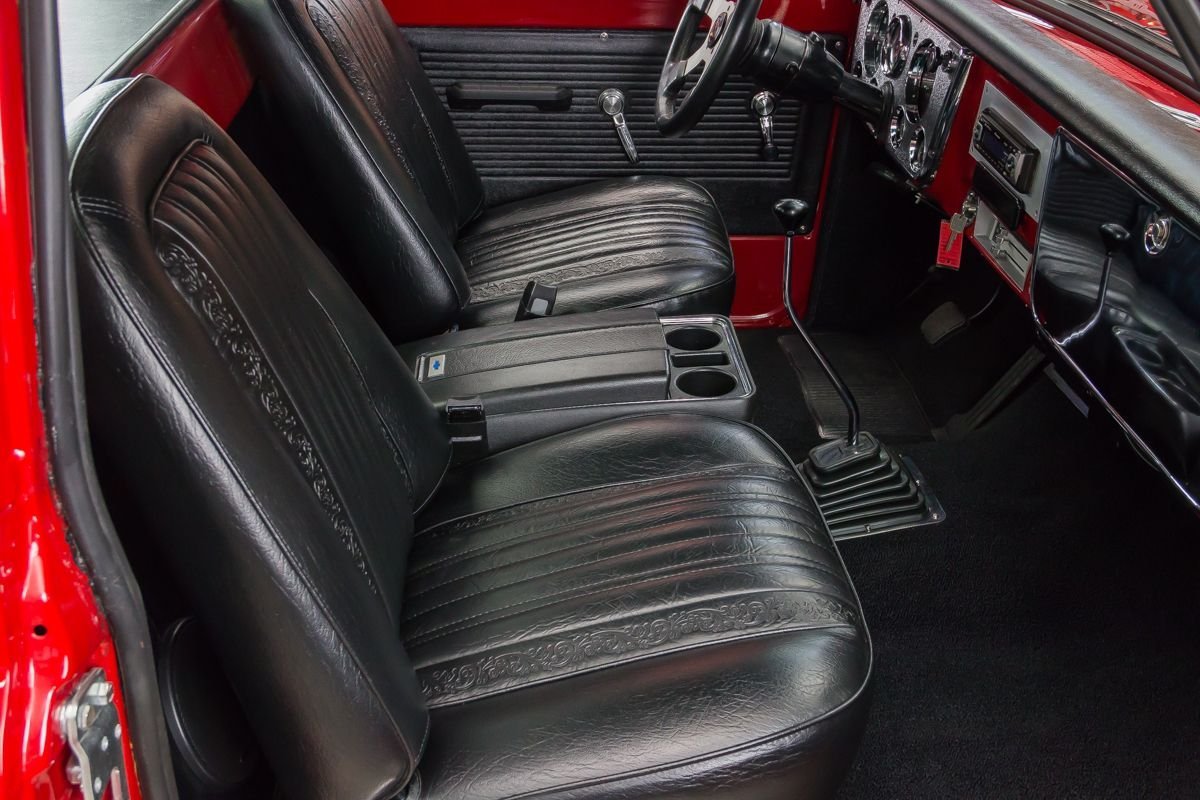 Under the hood, a 383 cubic-inch stroker V8 delivers strong performance paired with the familiar dependability of a TH350 automatic transmission. The truck’s drivetrain is complemented by power brakes, an updated suspension configuration, and a relocated fuel tank—modern touches that help improve both safety and drivability. A new dual-exhaust system with Flowmaster mufflers adds a deep tone without overwhelming the driving experience.