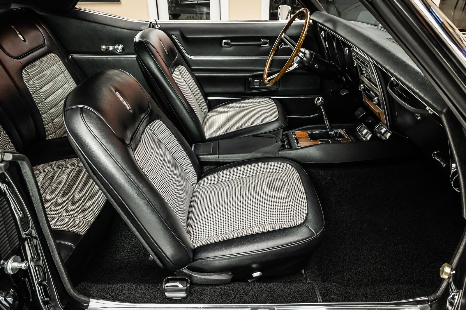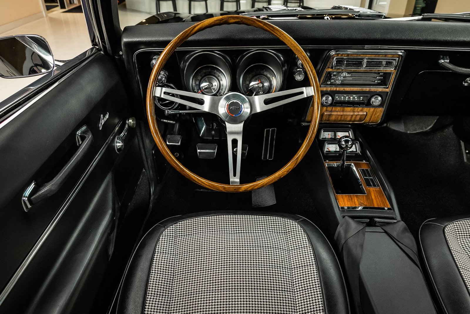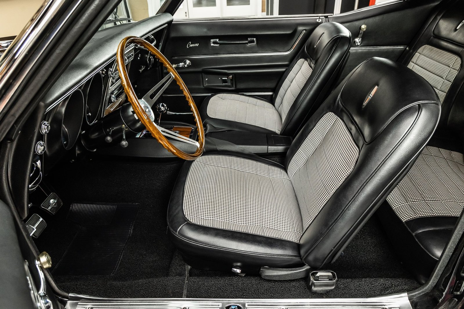 This example has undergone a comprehensive rotisserie restoration and presents beautifully in black with contrasting white stripes. The body is straight and well-finished, showcasing the Camaro’s sharp lines and unmistakable profile. Subtle exterior details and period-correct styling elements give the car a timeless look that feels equally at home at a car show or cruising the streets.