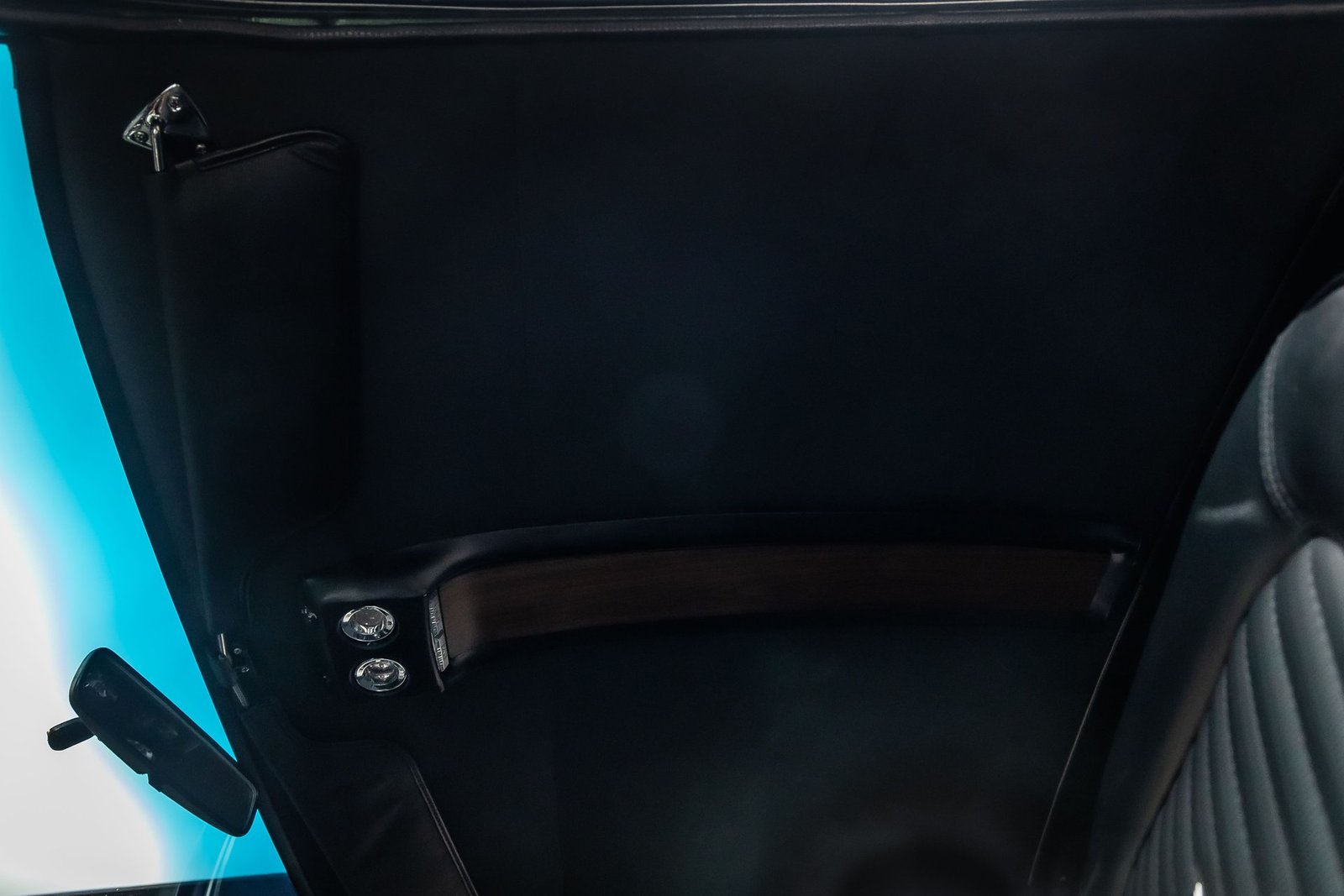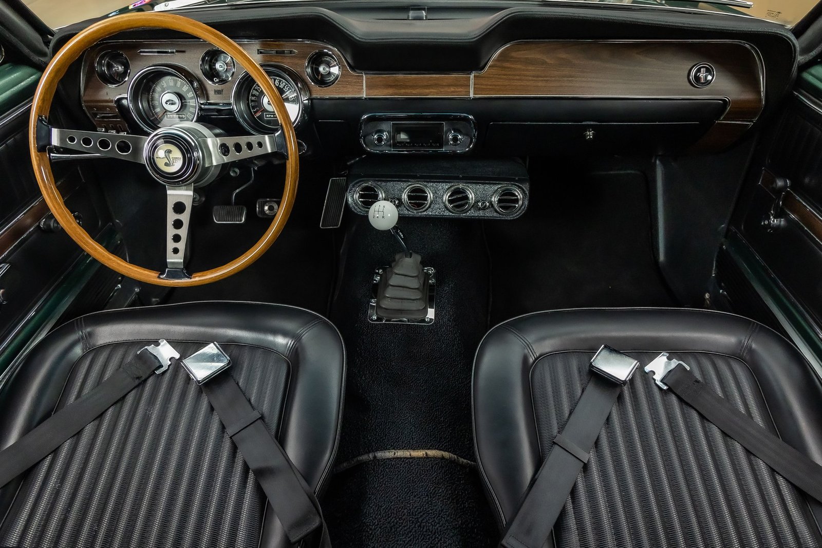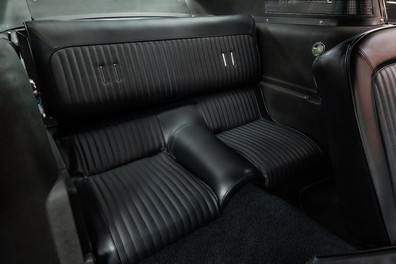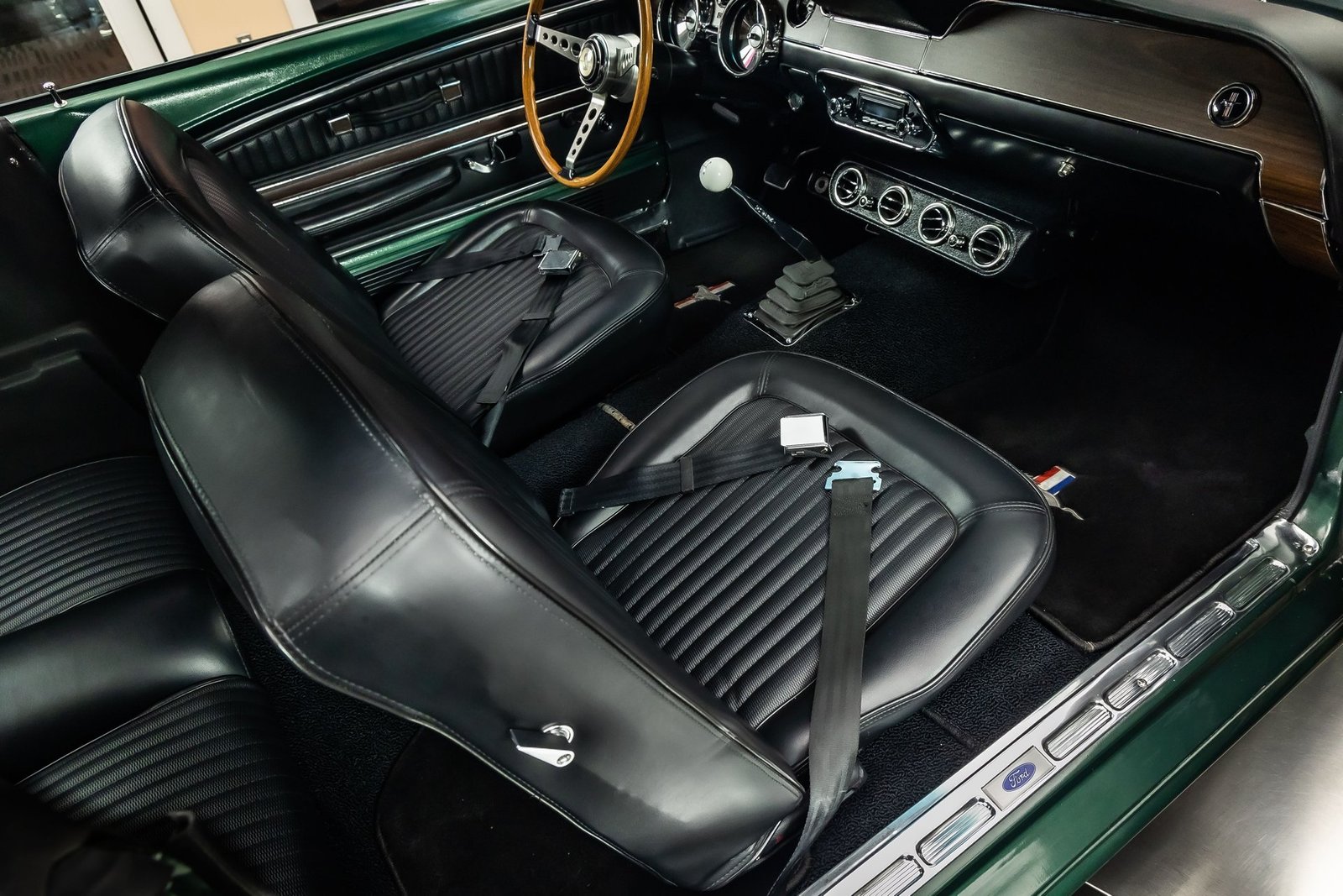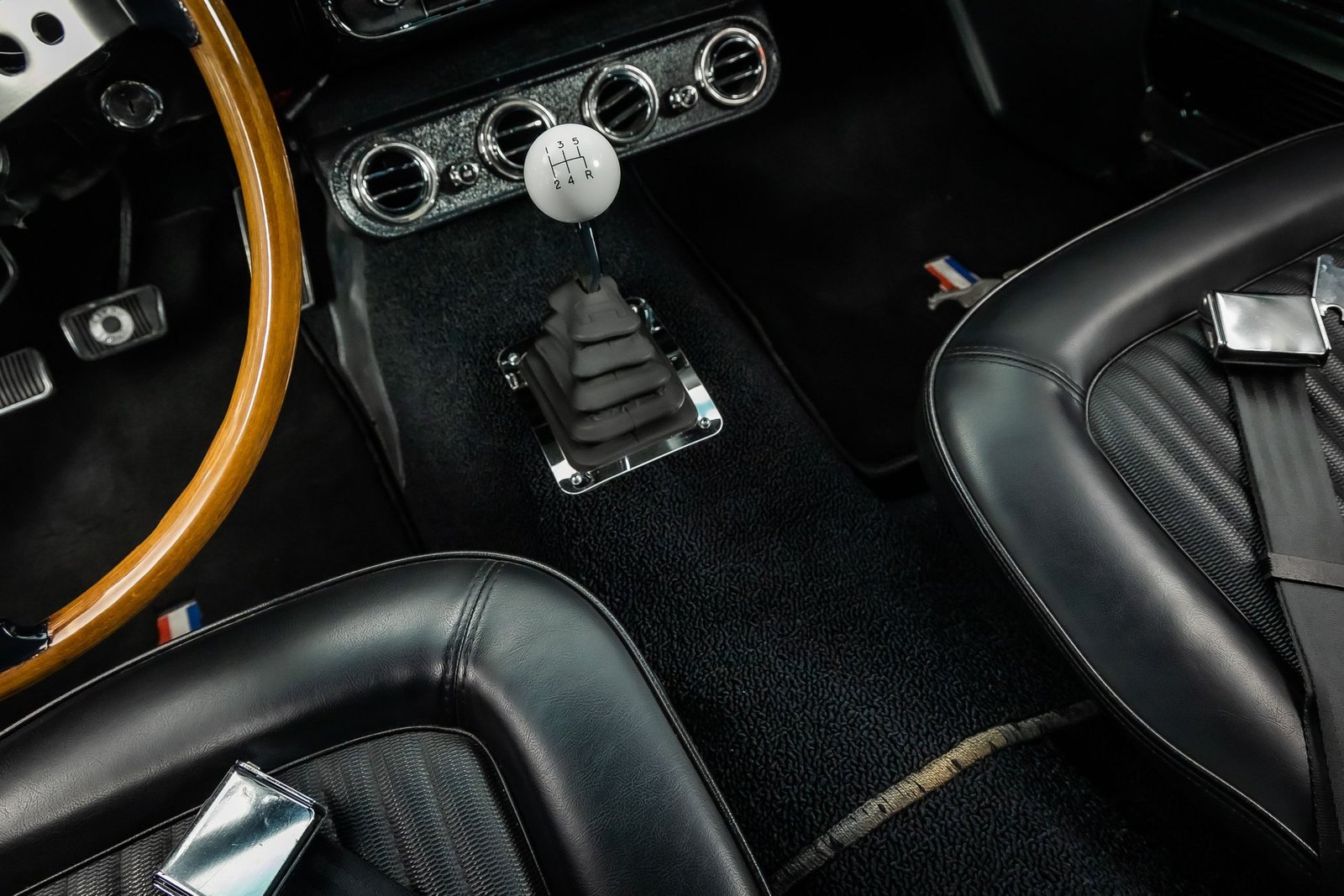 The interior continues the driver-focused theme with a restored black cabin, bucket seats, and a floor-mounted shifter. Stock-style gauges and a factory-inspired steering wheel preserve the original Mustang feel, while thoughtful updates enhance comfort and usability without detracting from the car’s vintage character.