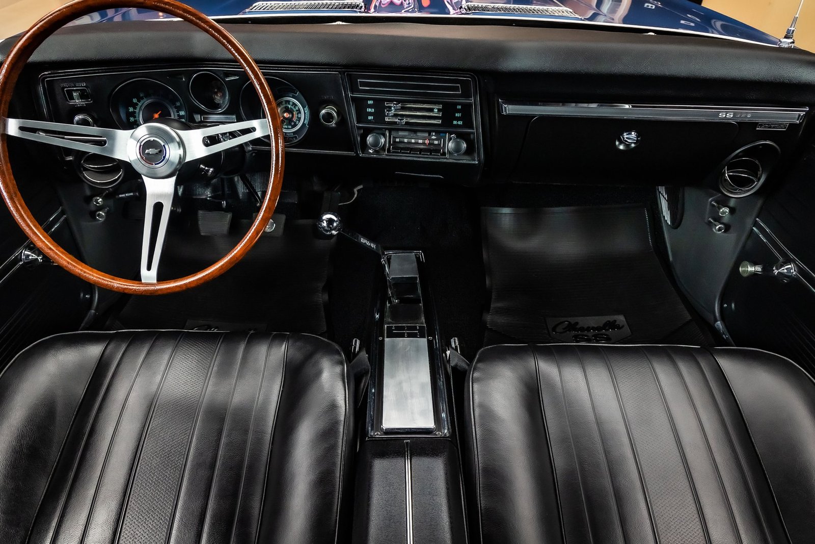 This example is a documented Super Sport that has undergone a complete, no-expense-spared frame-off restoration, resulting in a car that presents at an exceptionally high level. Finished in Dark Blue Metallic with a contrasting white side stripe, the exterior highlights the Chevelle’s muscular proportions while remaining true to its factory-correct appearance. The overall fit and finish reflect the care taken to preserve originality throughout the build.