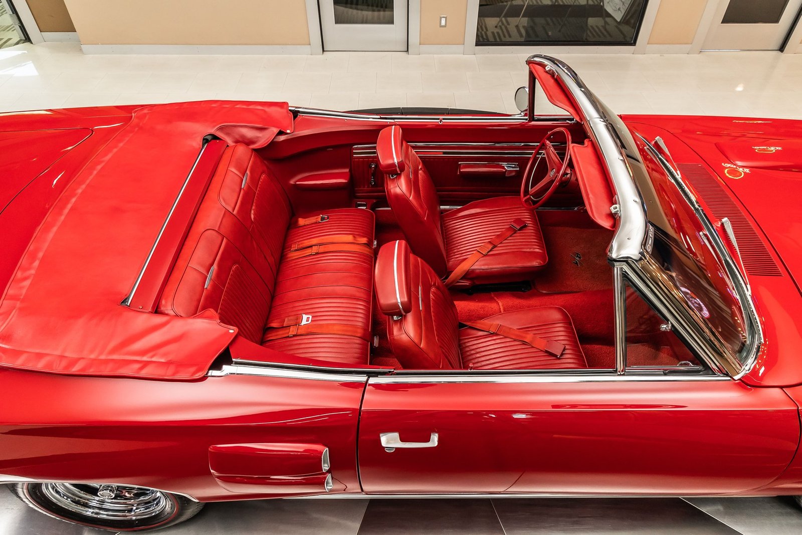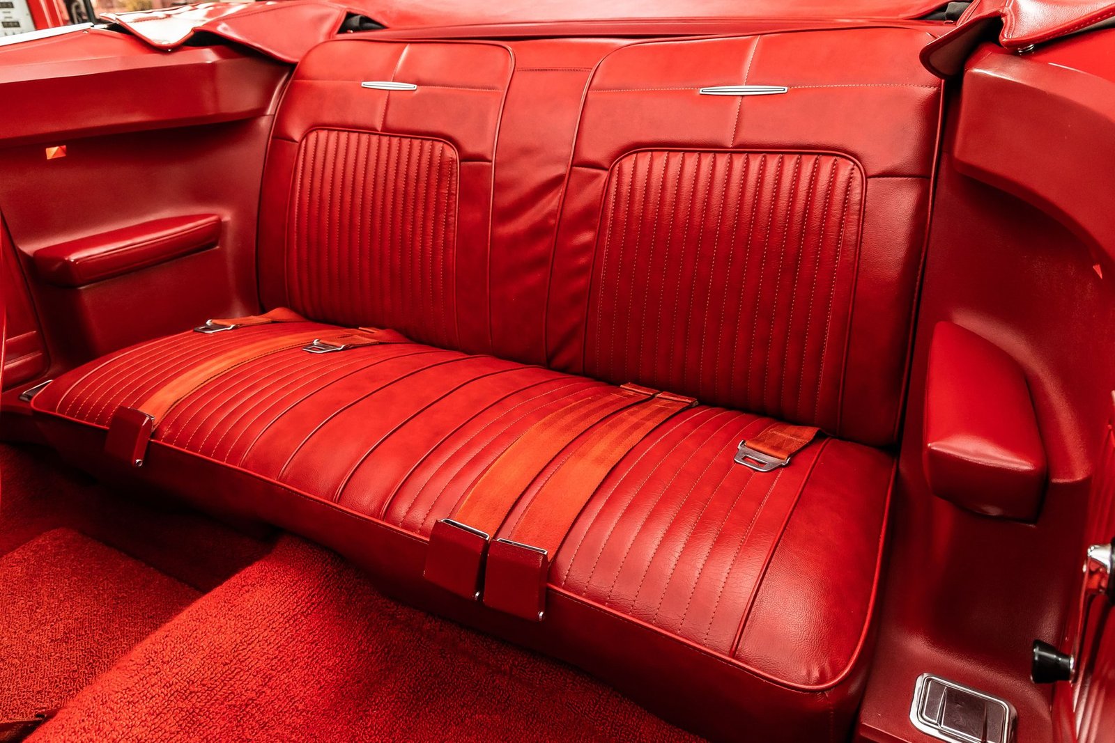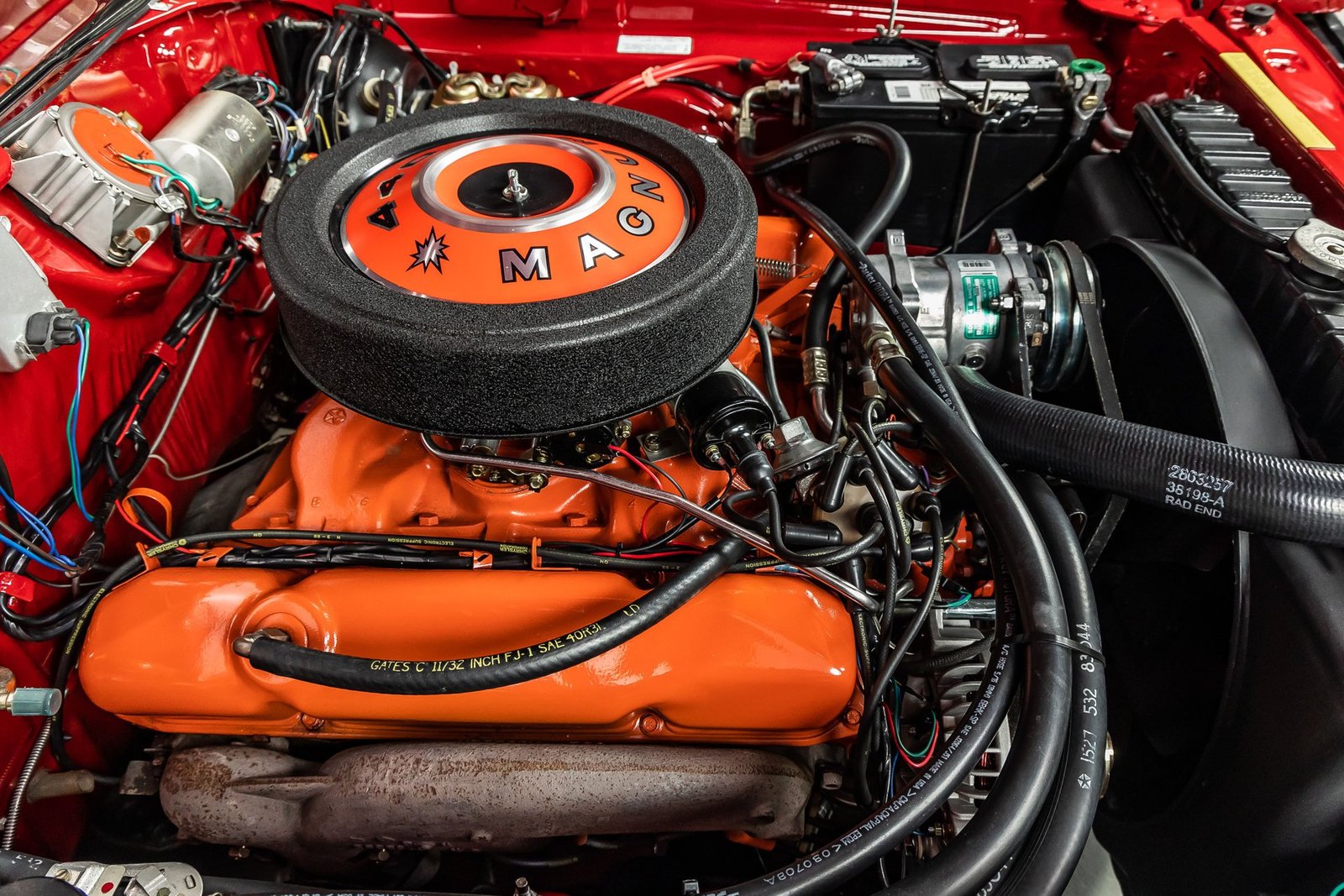 Inside, the red interior has been restored to a factory-correct look, featuring bucket seats, a column shifter, and stock-style instrumentation. The power convertible top allows for effortless open-air enjoyment, rounding out a classic muscle car experience that blends performance, comfort, and standout style.