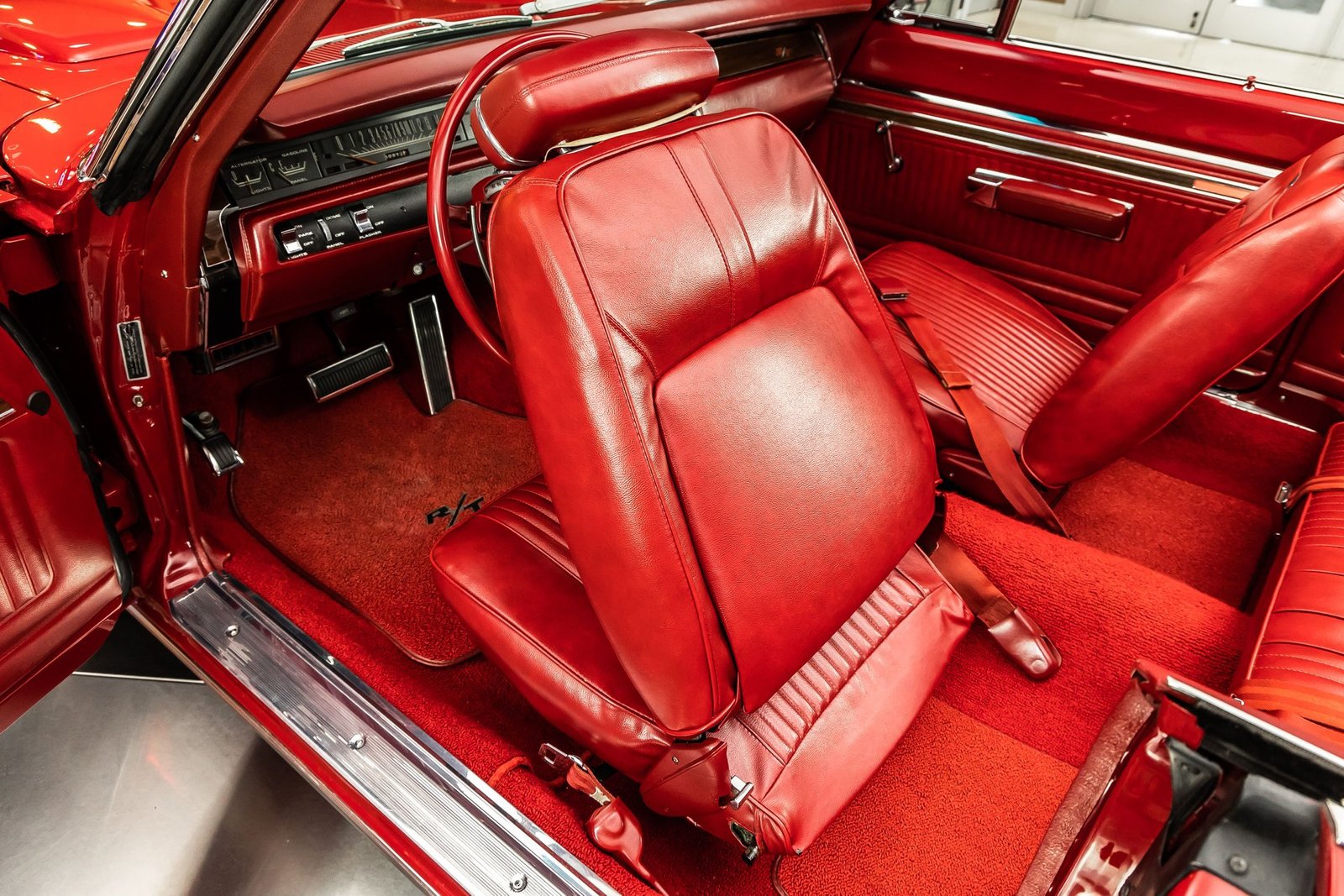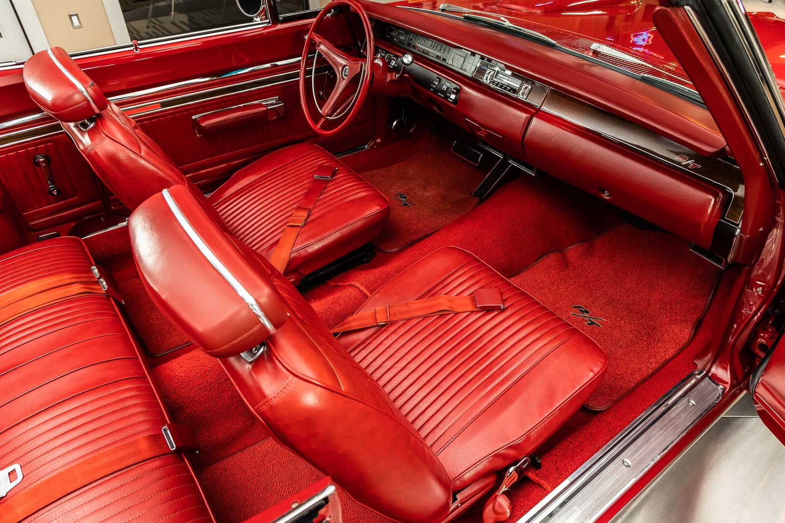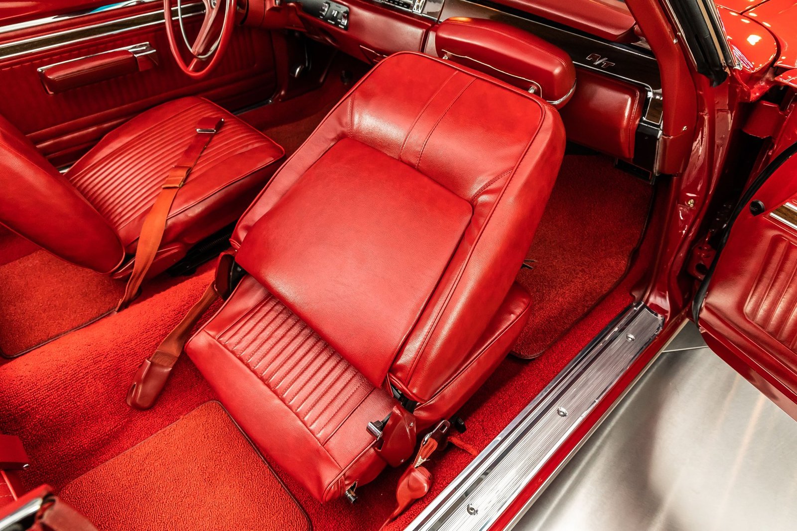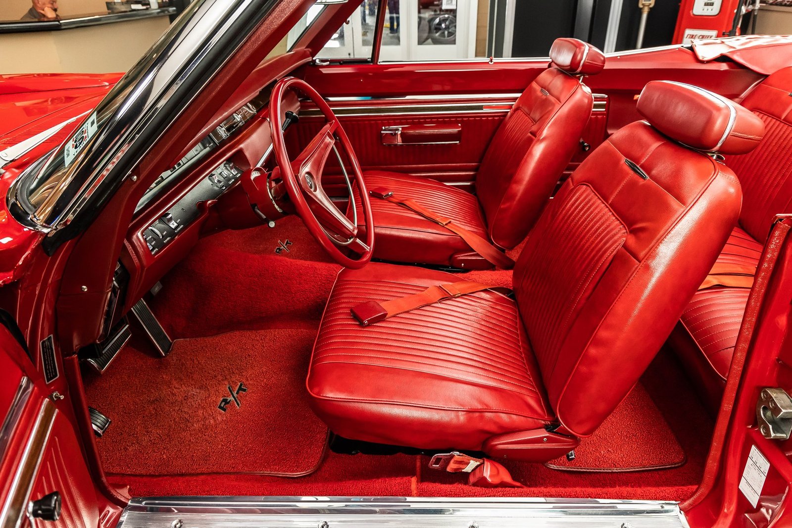 Inside, the red interior has been restored to a factory-correct look, featuring bucket seats, a column shifter, and stock-style instrumentation. The power convertible top allows for effortless open-air enjoyment, rounding out a classic muscle car experience that blends performance, comfort, and standout style.