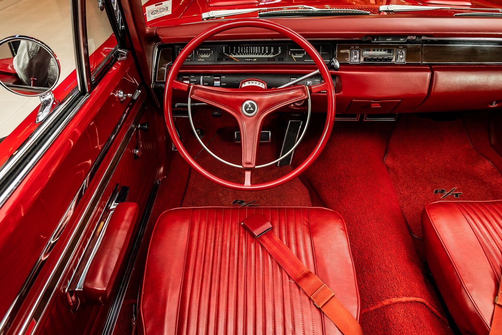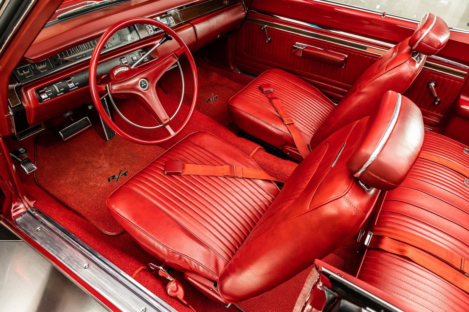 This example has undergone a full rotisserie restoration, resulting in a car that presents beautifully from every angle. Finished in vibrant red with contrasting black rear stripes, the exterior captures the aggressive yet elegant look that defines the Coronet R/T. Classic Magnum wheels and polished trim further enhance the car’s unmistakable muscle-era appearance.
