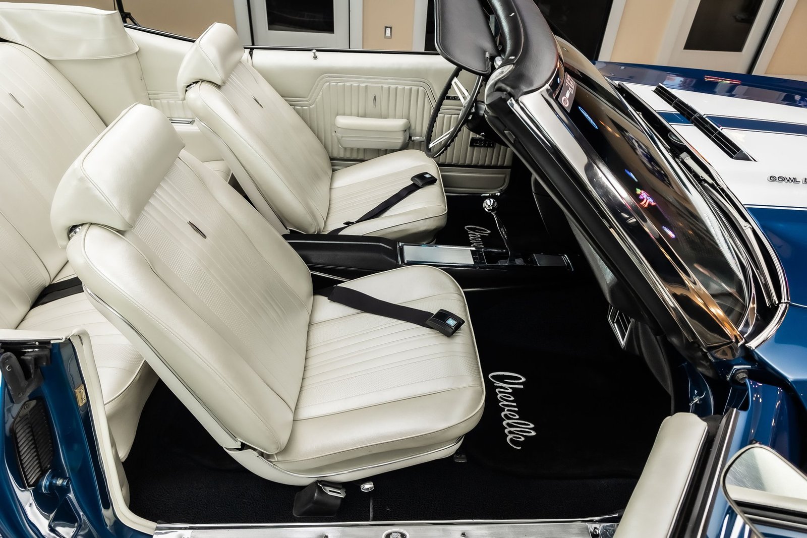 This example has been the recipient of a meticulous frame-off, rotisserie-style build completed over several years, resulting in a car that balances show-quality presentation with strong road manners. Finished in Fathom Blue with white center stripes and a white power-operated convertible top, the exterior highlights the Chevelle’s iconic lines while maintaining a period-correct appearance that never goes out of style.
